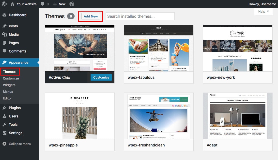 要安装新主题,请登录您的 WordPress 网站并导航至外观 > 主题 > 添加新主题。在这里,您可以浏览通过 WordPress.org 提供的免费主题,也可以单击“上传主题”按钮上传您在其他地方下载或购买的主题的 zip 文件。