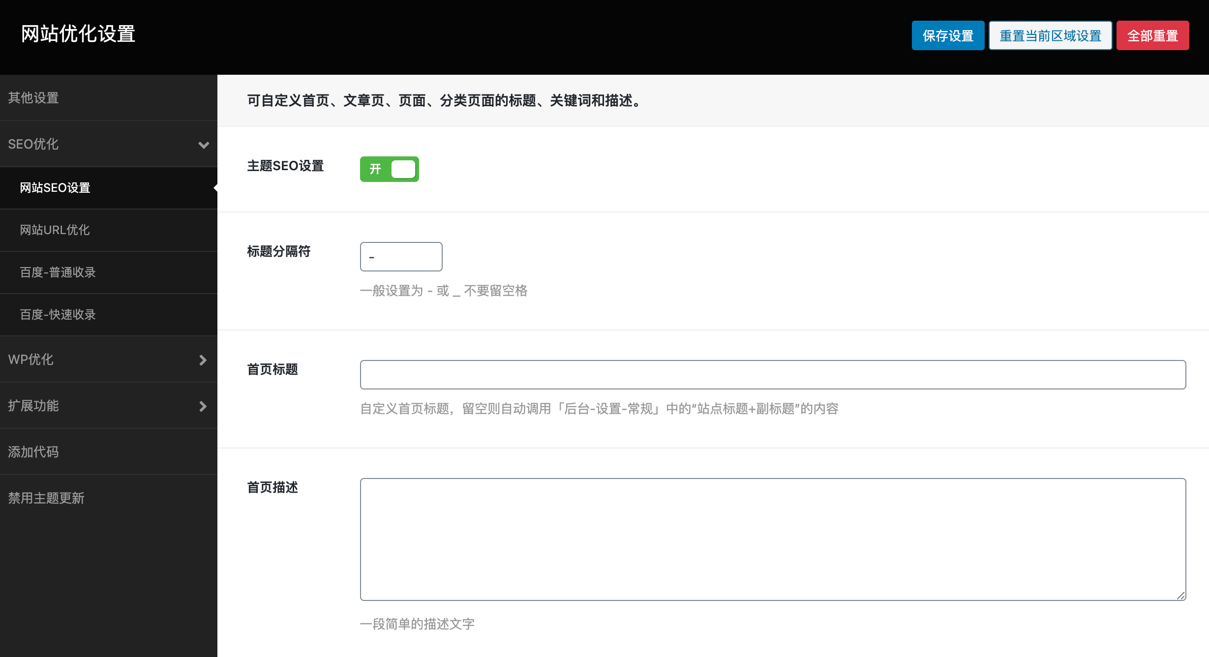 我们的WordPress模块主题都自带SEO设置,可自定义网站首页,分类页面、文章页面,独立页面的标题、关键词和描述。