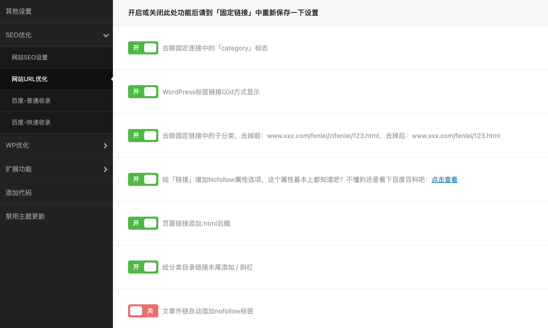 除了基础的自定义标题、关键词和描述之外,我们给网站链接也做了一些优化,这些功能也都可以选择性开启或关闭,从某种意义上来说,这些选项对网站SEO都是有一些帮助的。